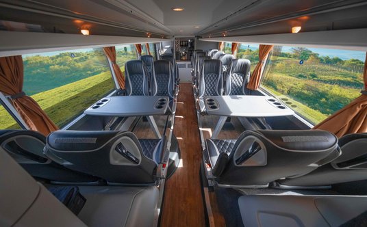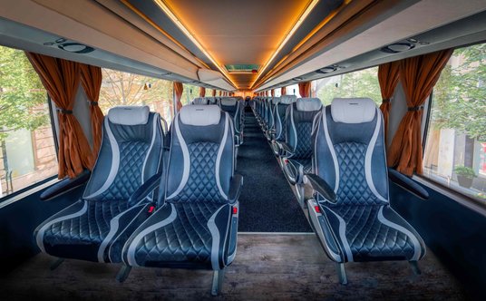 RegioJet wprowadza nowy standard podróżowania między Polską a Czechami - głosi komunikat. Na górnym pokładzie znajdują się siedzenia w układzie 2+1, dzięki czemu pasażerowie mają więcej przestrzeni i prywatności. Każdy fotel jest regulowany, wyposażony w indywidualny ekran z filmami, grami i prasą online, a także stolik.