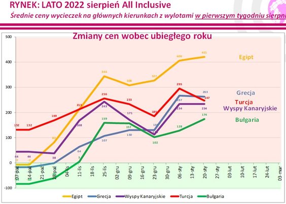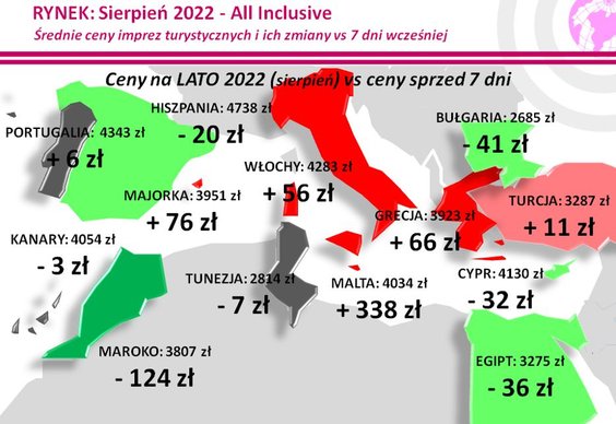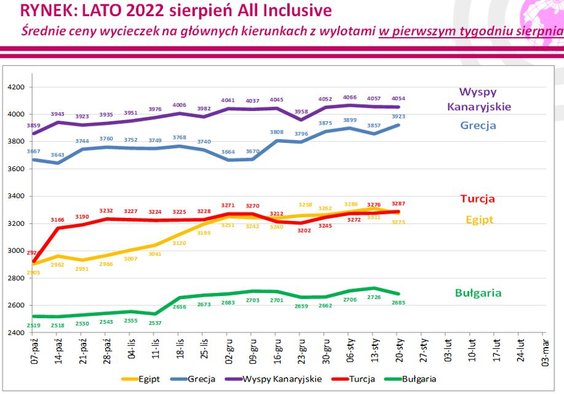 W ostatnim tygodniu średnia cena wycieczki z wylotem między 1 i 7 sierpnia 2022 roku wzrosła o 12 złotych – podaje w cotygodniowym raporcie z badania cen w biurach podróży Instytut Badań Rynku Turystycznego Traveldata*.