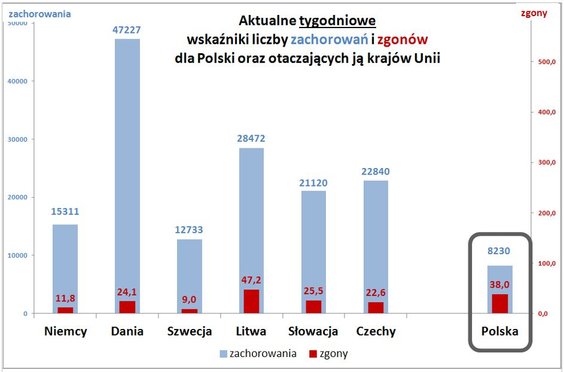 W Polsce warunki do prawidłowej oceny fazy epidemii na podstawie zgonów są na razie trudniejsze, gdyż nakładają się na nie jeszcze końcowe efekty zakażeń poprzednim bardziej śmiertelnym wariantem Delta.