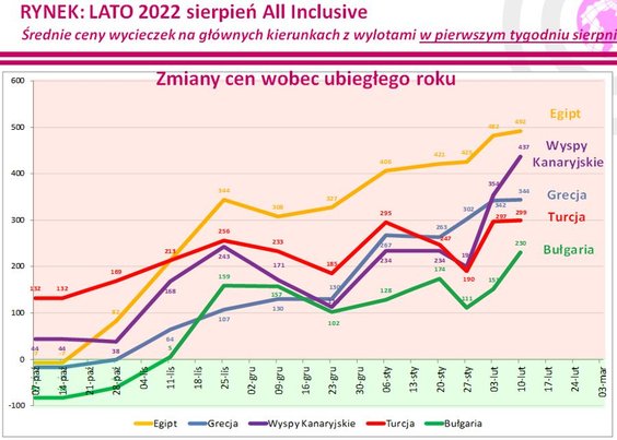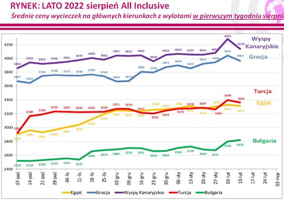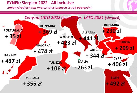 Zarazem największy wzrost średnich cen w ostatnim tygodniu widać było odnośnie do wyjazdów na Sycylię (poprzednio ceny najbardziej tam spadły) i do Maroka – odpowiednio o 196 i 158 złotych. W mniejszej skali także na Maltę – o 105 złotych.