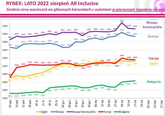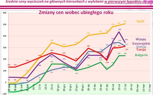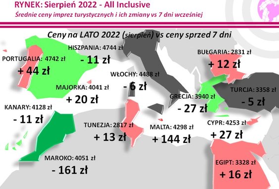 W ostatnim tygodniu średnia cena wycieczki z wylotem między 1 a 7 sierpnia 2022 roku, spadła o 4 złote. Tak małej zmiany raporty jeszcze nie notowały, w poprzednich tygodniach cena rosła o 42, 113, 20, 12 i 22 złote, a wcześniej spadła o 21 złotych – to pierwszy wniosek z badania cen przeprowadzonego przez Instytut Badań Rynku Turystycznego Traveldata i zawartego w najnowszym, cotygodniowym raporcie.