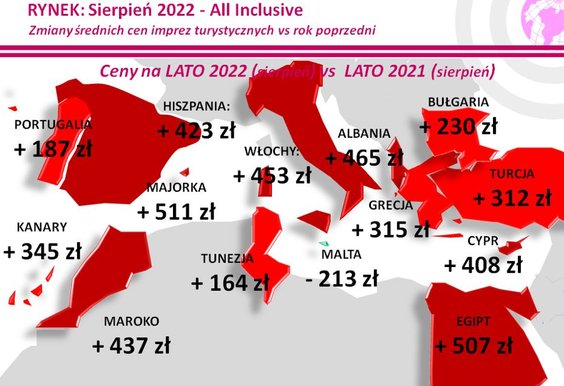 Z kolei największy wzrost średniej ceny Traveldata zauważyła w wypadku wyjazdu na Maltę (poprzednio ceny również tam znacznie wzrosły) – o 144 złote. W mniejszej skali wzrosła cena wypoczynku na półwyspie Chalcydyckim i w Portugalii – o 59 i 44 złote.