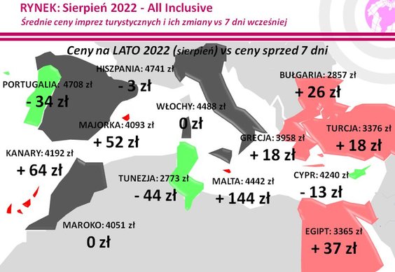 Największy wzrost średniej ceny w ostatnim tygodniu ponownie odnotowano w wypadku Malty (w poprzednich dwóch tygodniach ceny również znacznie tam wzrosły) – o 144 złote, a w mniejszej skali Teneryfy i Lanzarote – o 126 i 105 złote.