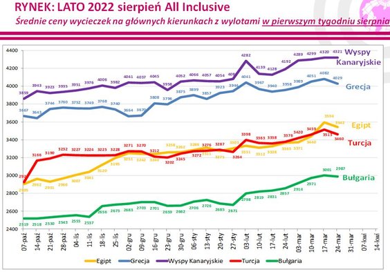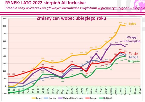 *Zestawienie obejmuje siedemnaste w tym roku porównanie cen wycieczek z wylotem w szczycie sezonu letniego definiowanego na potrzeby porównań jako okres pierwszego tygodnia sierpnia, czyli od 1 do 8 sierpnia 2022 roku. Ceny dla tego okresu zostały zebrane 24 marca 2022 i zestawione z cenami dla tego samego okresu dla wylotów z 17 marca, a przy porównaniach cen rok do roku z cenami zebranymi 24 marca 2021 roku.