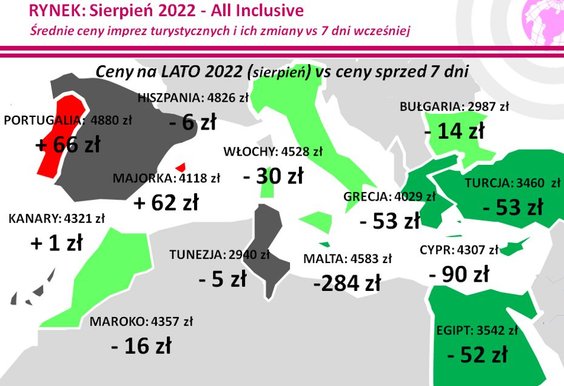 Najwięcej najtańszych wyjazdów w szczycie sezonu do Egiptu proponowały TUI Poland (7) i Exim Tours (4), do Grecji TUI Poland (9), Itaka (6), Rainbow i Exim Tours (po 5), na Wyspy Kanaryjskie TUI Poland (12), Itaka (6) i Rainbow (4), do Turcji Coral Travel (9) i TUI Poland (4), do Tunezji TUI Poland (6), Coral Travel (3) i Exim Tours (2), a w Bułgarii TUI Poland (3) i Exim Tours (2 oferty).