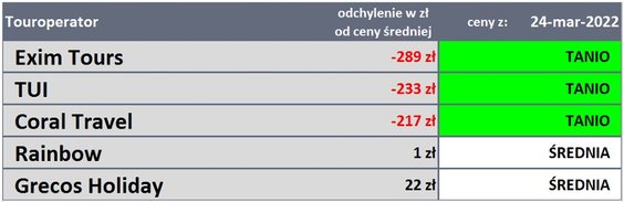 Całość materiału zamykają tabelą z biurami podróży, które w ostatnim tygodniu po przekrojowo najniższych cenach oferowały klientom imprezy turystyczne. Tym razem nie nastąpiła żadna zmiana w składzie pierwszej piątki organizatorów, ale miały miejsce zmiany pozycji zajmowanych przez poszczególne biura. Najistotniejsza była zamiana na miejscu pierwszym i drugim, gdyż miejsce lidera opuścił TUI Poland, a zajął je Exim Tours. Przyczyną był wzrost cen w pierwszym biurze i ich spadek w biurze drugim. Z pozycji czwartej na piątą przesunął się Grecos, a ruch odwrotny wykonał Rainbow.