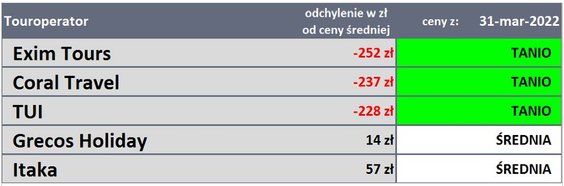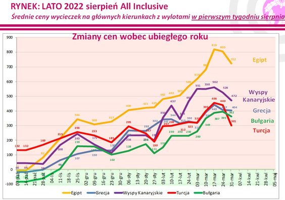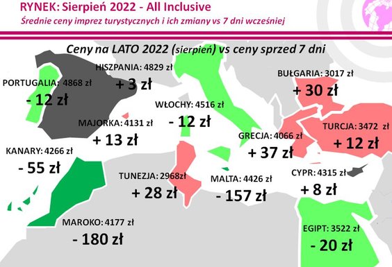 Zmiany cen wycieczek w ostatnim tygodniu obrazuje mapa, a ich przebieg w tym sezonie na najważniejszych kierunkach przedstawia zamieszczony niżej wykres.