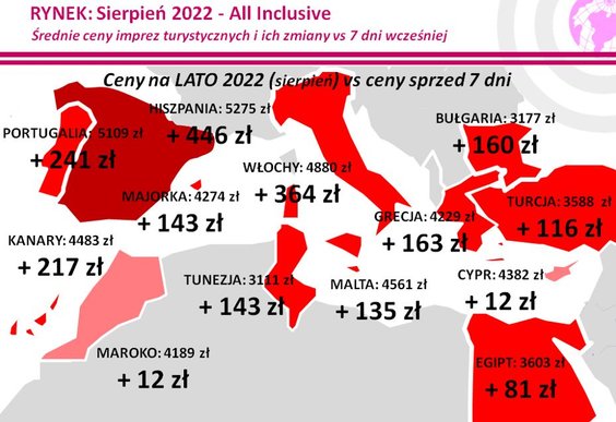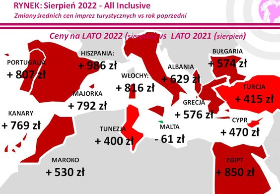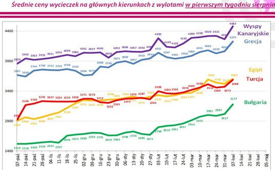Wśród pięciu najważniejszych kierunków najbardziej w ciągu roku zdrożały oferty wyjazdów letnich do Egiptu, o 850 złotych, i na Wyspy Kanaryjskie – o 769 złotych. Mniejsze były zwyżki cen wakacji w Grecji i Bułgarii – o 576 i 574 złote, a najmniejsze w Turcji – o 415 złote.