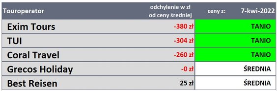 W tej sytuacji wspólny wpływ wymienionych czynników na średnią zmianę kosztów wycieczek nadal nie sprzyjał organizatorom, ale skala ich negatywnego wpływu z powodu istotnie słabszego złotego nieco się zwiększyła. Tym razem zawierał się on w przedziale 420 - 430 złotych, podczas gdy przed tygodniem było to 405-415 złotych, a przed dwoma 390-400 złotych.