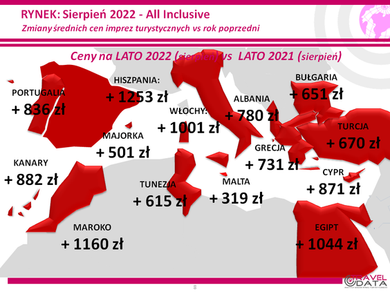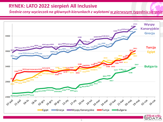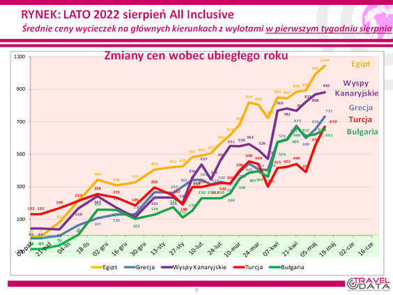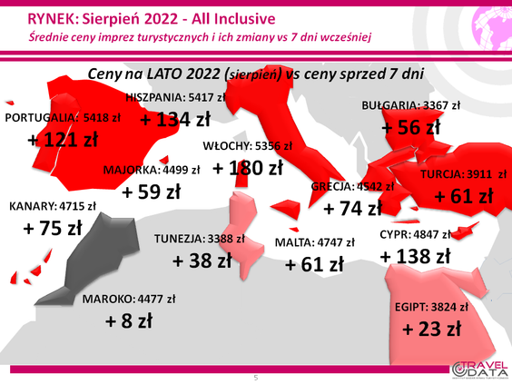 Zmiany cen wycieczek w ostatnim tygodniu obrazuje mapa, a ich przebieg w tym sezonie na najważniejszych kierunkach przedstawia wykres poniżej.