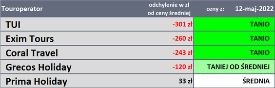 Z drugiej strony największy spadek cen wystąpił w odniesieniu do półwyspu Chalcydyckiego (poprzednio ceny tam silnie wzrosły) – o 18 złotych. Niewiele mniej spadła cena wyjazdu do Szarm el-Szejk – o 13 złotych.