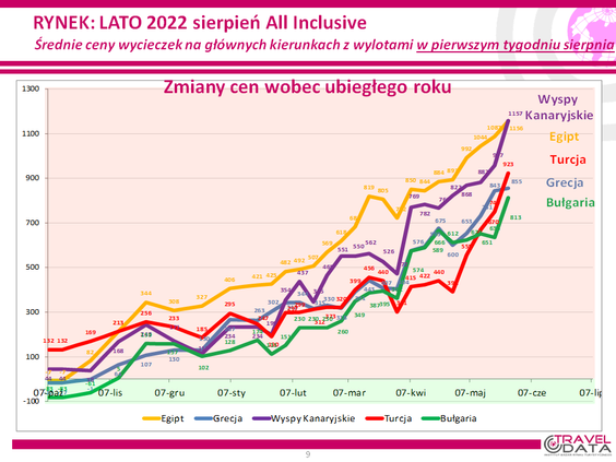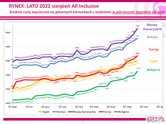 W ostatnim tygodniu średnia cena wycieczki w biurze podróży z wylotem między 1 i 7 sierpnia wzrosła o 78 złotych. To kolejna z serii podwyżek, jakie mają miejsce (z małym wyjątkiem) od początku roku. W poprzednich tygodniach średnie ceny rosły bowiem siedem razy z rzędu o 68, 70, 150, 10, 27, 28 i 167 złotych, wcześniej spadały o 10 i 31 złotych, a jeszcze wcześniej wzrastały o 54, 49, 46 i 19 złotych – wynika z najnowszego cotygodniowego raportu Instytutu Badań Rynku Turystycznego Traveldata*.