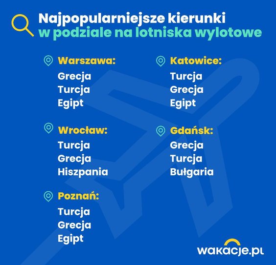 Jakie inne kierunki wybierają w tym roku Polacy? Miejsca od 4 do 10 w rankingu zajmują Hiszpania, Bułgaria, Tunezja, Cypr, Albania, Włochy i Zjednoczone Emiraty Arabskie.