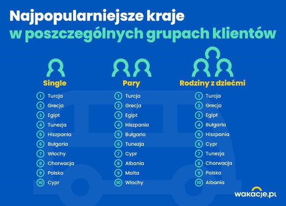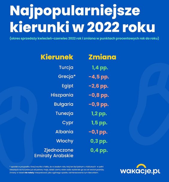 W drugim kwartale najpopularniejszymi kierunkami były Turcja, Grecja i Egipt. Ich udział w sprzedaży wyniósł łącznie 58,1 procent. Nie była to jednak wartość imponująca, rok wcześniej te trzy pierwsze kierunki zgarniały bowiem dużo większą, bo 63,7-procentową, pulę. Zmian w rozkładzie zainteresowania klientów Wakacje.pl upatrują między innymi w powrocie Tunezji do programów biur podróży. „W zeszłym roku z uwagi na dość restrykcyjne zasady wjazdu kraj ten praktycznie wypadł z oferty. Obecnie przeżywa renesans” – czytamy w komunikacie.