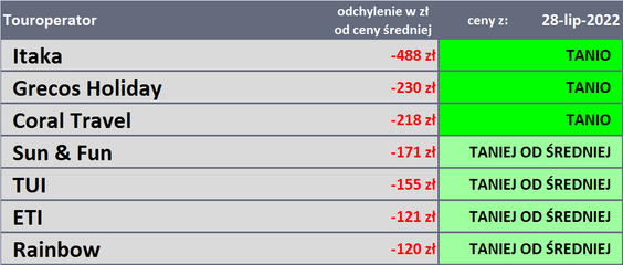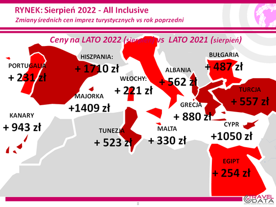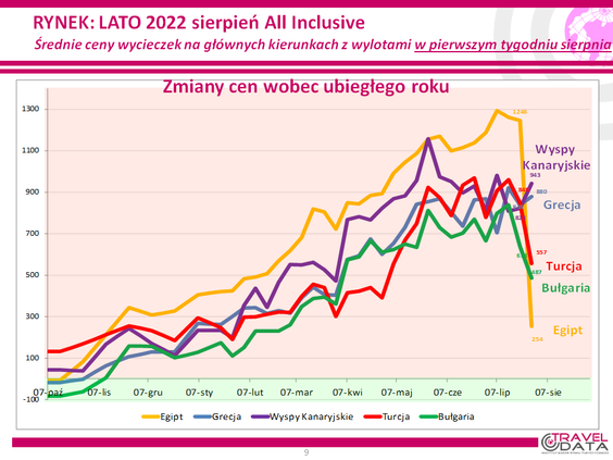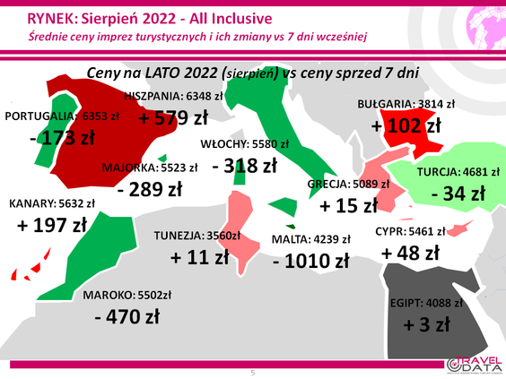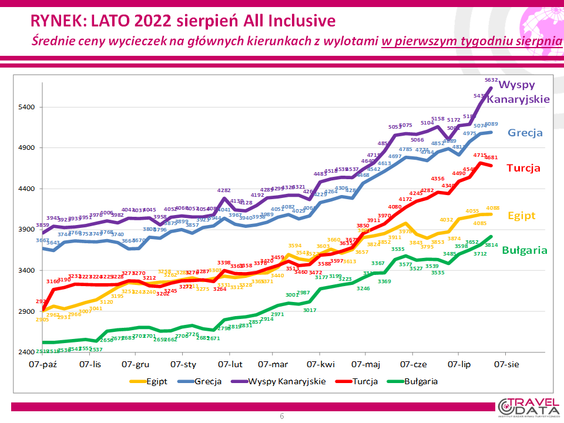 W ostatnim tygodniu średnia cena dla wycieczki z wylotem między 1 i 7 sierpnia 2022 spadła o 3 złote. To wyjątkowa sytuacja, ponieważ od kilkunastu tygodni ceny generalnie rosły. I tak w poprzednich zestawieniach Traveldata notowała wzrost o 142, 77 i 96 złotych, wcześniej spadek o 58 złotych, a jeszcze wcześniej wzrost (z jednotygodniowym wyjątkiem), jedenaście razy z rzędu o 72, 11, 90, 78, 68, 70, 150, 10, 27, 28 i 167 złotych – podaje Instytut Badań Rynku Turystycznego Traveldata w najnowszym, cotygodniowym raporcie z badania cen w biurach podróży*. To już ostatnie wyniki obejmujące ceny w tym terminie. Liczba ofert była już mocno ograniczona, a ich ceny zmieniły się w dużo większym stopniu niż zwykle – zauważają autorzy opracowania.