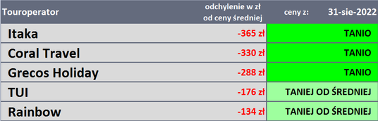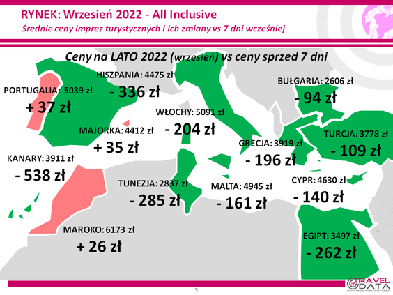 W rocznych porównaniach średnich cen wycieczek ceny wyjazdów we wrześniu 2022 nie obniżyły się w żadnym z biur podróży, a najmniejsze roczne wzrosty cen wyjazdów znalazły się w ofertach  biur Itaka, Grecos i Rainbow– o 360, 420 i 430 złotych. Średnie ceny w pozostałych biurach podróży były wyższe niż przed rokiem w granicach od 540 (TUI Poland) do ponad 1100 złotych – relacjonują wyniki swoich dociekań eksperci z Traveldaty.