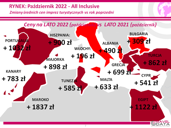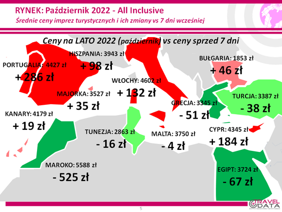 Z pięciu wiodących kierunków zdecydowanie najwięcej, licząc rok do roku, skoczyła cena wypoczynku w Egipcie – o 1122 złotych. Mniej podrożały wyjazdy do Turcji, na Wyspy Kanaryjskie i do Grecji – o 862, 783 i 699 złotych. Najskromniej w skali roku wzrosła cena wycieczek do Bułgarii, bo o 309 złotych – wylicza raport Traveldaty.