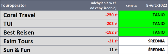 W liczbie najniższych bieżących cen wycieczek, czyli na pierwszym lub drugim miejscu w wypadku 30 kierunków sezonu letniego w trzech kategoriach hoteli, liderem był TUI Poland z liczbą 43 ofert, a za nim Rainbow z 24 takimi ofertami i Exim Tours z liczbą 19 podobnych ofert.