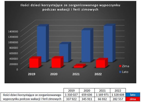 W 2022 roku zgłoszono w sumie wyjazd 1,611 miliona dzieci i młodzieży. Z tego 1,328 miliona latem, a 282,6 tysiąca zimą. To prawie identyczna liczba (tylko o 2,2 procent mniejsza) jak w najlepszym dotąd roku 2019. Wtedy na liście było 1,647 miliona uczestników wypoczynku, na lato zgłoszono 1,319 miliona osób, a na zimę 337,9 tysiąca.