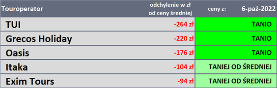 Żadne biuro podróży z monitorowanych przez Traveldatę nie miało mniejszych cen niż przed rokiem. Najmniejszy wzrost odnotowano w ETI, Itace i Grecosie - o 650, 690 i 820 złotych. Średnie ceny u pozostałych touroperatorów były wyższe niż przed rokiem od około 830 (TUI Poland) do prawie 1260 złotych.