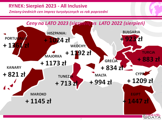 Jeśli chodzi o mniej uczęszczane kierunki, największe zwyżki cen w ujęciu rocznym Traveldata odnotowała w odniesieniu do Portugalii, Cypru, Włoch, Majorki i Maroka – odpowiednio o 1361, 1209, 1192, 1173 i 1145 złotych. Nieco mniej znacząco wzrosły ceny wypoczynku w Hiszpanii kontynentalnej i na Malcie – o 1024 i 994 złote. A najmniej podniosły się ceny wyjazdów do Tunezji i Albanii – o 713 i 693 złote.