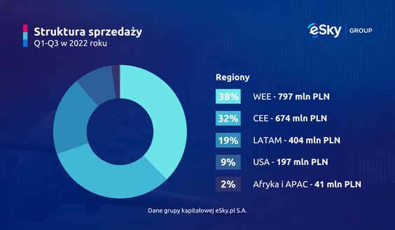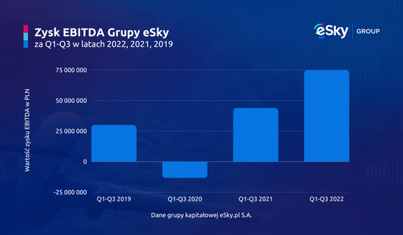 Wartość sprzedaży Grupy eSky za pierwsze trzy kwartały wzrosła o 88 procent w porównaniu z tym samym okresem zeszłego roku i wyniosła 2,1 miliarda złotych. To wynik lepszy o 11 procent niż w przedpandemicznym roku 2019. Zysk EBITDA wzrósł o 70 procent wobec roku 2021 i wyniósł 74 milionów złotych - podaje firma w komunikacie.