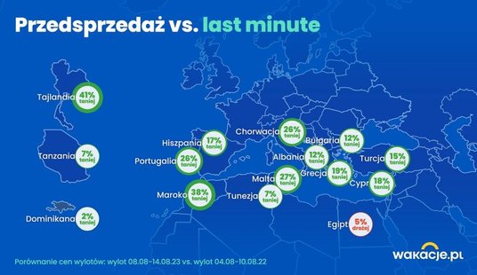 Wakacje.pl przyjrzały się cenom wycieczek zorganizowanych na przyszłe wakacje i zestawiły je z ofertami last minute z minionego sezonu. Okazuje się, że zazwyczaj wycieczki w przedsprzedaży są o kilkanaście procent tańsze od kupowanych w ostatniej chwili. Największe różnice widać w grupie dalekich krajów - w wypadku Tajlandii sięgają one 41 procent na korzyść tych zamawianych obecnie z terminem wylotu w sierpniu 2023 roku, a Maroka - 38 procent. Tańsze w przedsprzedaży są również najpopularniejsze kierunki wakacyjne - Turcja o 15 procent, Grecja o 19 procent, Hiszpania o 17 procent, a Bułgaria o 12 procent.