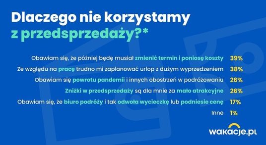 Mimo tych korzyści, nie wszyscy klienci są przekonani do kupowania wyjazdów z dużym wyprzedzeniem. Wakacje.pl chciały poznać powody, które powstrzymują Polaków przed wczesnym rezerwowaniem podróży. 39 procent pytanych obawia się, że w ostatniej chwili będzie musiało zmienić termin wyjazdu, a 38 procent nie może planować podróży z tak dużym wyprzedzeniem z powodów zawodowych. Inni natomiast boją się powrotu pandemii albo odwołania lub podniesienia ceny przez biuro podróży.