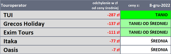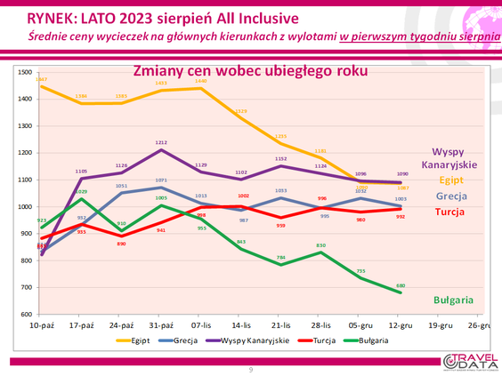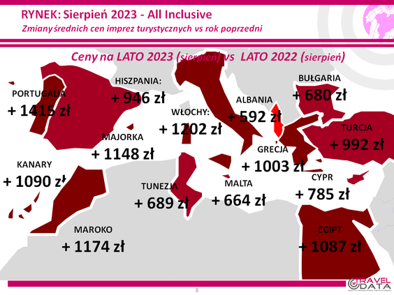 Traveldata porównała też ceny z zeszłego tygodnia z cenami sprzed roku. Okazało się, że średnia cena tegoroczna była wyższa od średniej zeszłorocznej o 991 złotych. Pierwszy raz więc, odkąd Traveldata monitoruje wczesną sprzedaż podróży sezonu 2023 w biurach podróży, różnica zeszła poniżej tysiąca złotych. Wcześniej średnie ceny były wyższe bowiem o 1014, 1023, 1035, 1027 i 1056 złotych. Choć raport Traveldaty nie wyjaśnia tej sytuacji, można z dużym prawdopodobieństwem uznać, że to efekt zmiany bazy, do której porównuje się obecne ceny* - rok temu musiała być nieco wyższa - i oczywiście obniżki średniej ceny w zeszłym tygodniu.