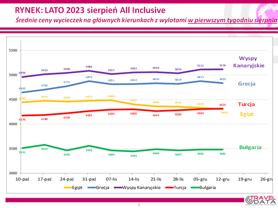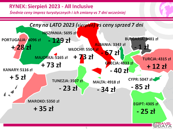 W minionym tygodniu tylko dwa z pięciu najpopularniejszych kierunków letnich wyjazdów Polaków zdrożały Turcja i Wyspy Kanaryjskie. Ta pierwsza o 12, a te drugie o 5 złotych. Trzy pozostałe zniżkowały – Grecja o 40 złotych, Egipt o 25 złotych, a Bułgaria o złotówkę – podaje Traveldata.