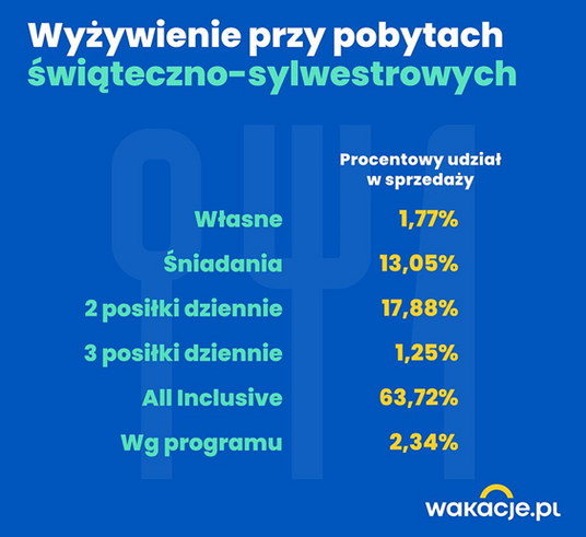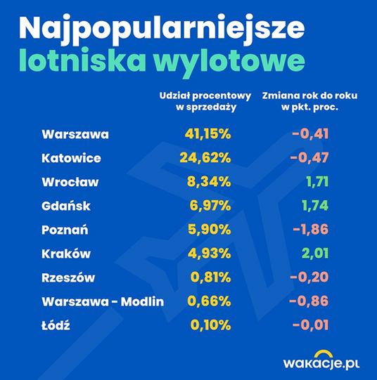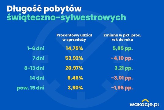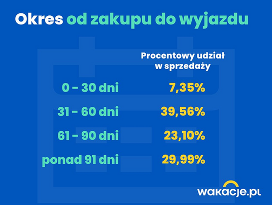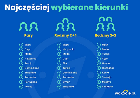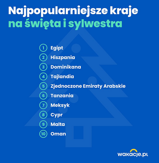 Z badania wynika też, że najpopularniejszymi kierunkami będą w tym roku Egipt, Hiszpania, Dominikana, Tajlandia i Zjednoczone Emiraty Arabskie. Stanowią one łącznie 53 procent sprzedaży wycieczek w tym terminie. Z pierwszej dziesiątki najchętniej wybieranych krajów największe wzrosty sprzedaży notuje Tajlandia (wzrost o 5,4 puntu procentowego, licząc rok do roku).