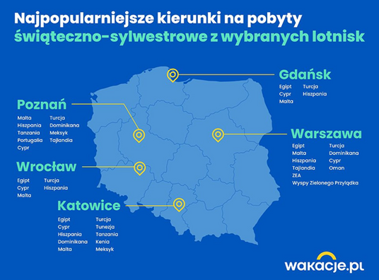 W okresie świąteczno-noworocznym klienci biur podróży preferują wypoczynek pod palmami, na który najchętniej udaliby się z lotniska położonego najbliżej ich miejsca zamieszkania - to główny wniosek z analizy statystyk sprzedaży wycieczek z terminem rozpoczęcia od 18 grudnia do 6 stycznia, którą przeprowadził multiagent Wakacje.pl.