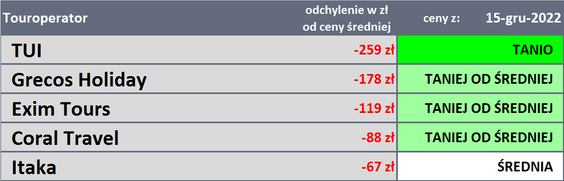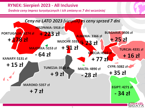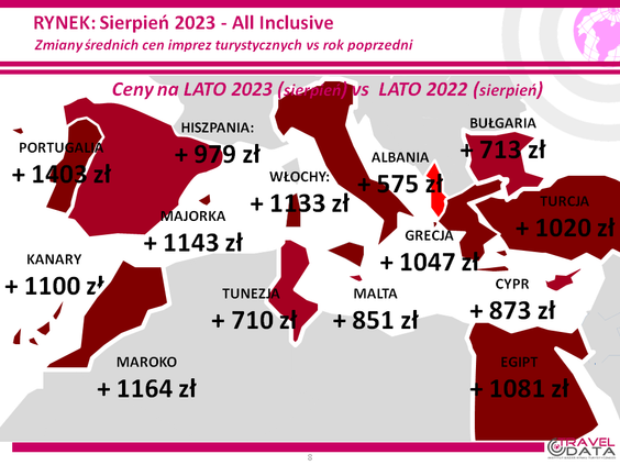 Największe zniżki cen wystąpiły w wypadku wyjazdu do Kalabrii, o 173 złote, na półwysep Chalcydycki (poprzednio odnotowano tam znaczące zwyżki), o 92 złote, i na Majorkę, o 64 złote. Największe podwyżki w ostatnim tygodniu były większe niż obniżki. Sardynia (ponownie) zdrożała o 342 złote, Portugalia o 178 złotych, a Costa del Sol o 69 złotych – wyliczają autorzy raportu.