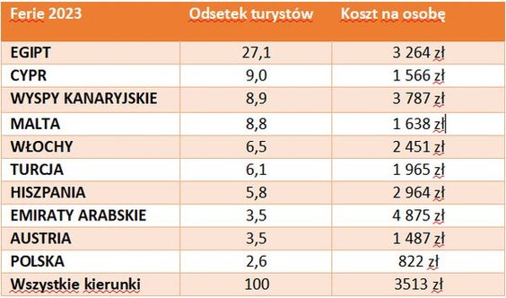 Druga pod względem wielkości w kraju turystyczna sieć agencyjna, Travelplanet.pl, podsumowała sprzedaż wyjazdów na ferie zimowe. Do połowy grudnia najwięcej jej klientów (27 procent) zarezerwowało wyjazd do Egiptu. Inne popularne pojedyncze kierunki to Cypr, Wyspy Kanaryjskie i Malta. Udział ich rezerwacji był bardzo zbliżony do siebie, kolejno: 9, 8,9 i 8,8 procent. W pierwszej dziesiątce zmieściły się jeszcze Włochy - 6,5 procent, Turcja - 6,1 procent, Hiszpania kontynentalna - 5,8 procent, Emiraty Arabskie - 3,5 procent, Austria - 3,5 procent i Polska - 2,6 procent.