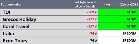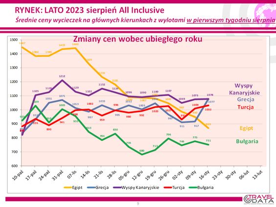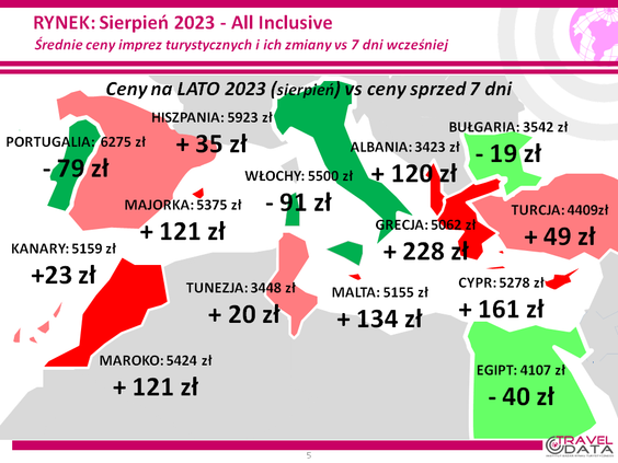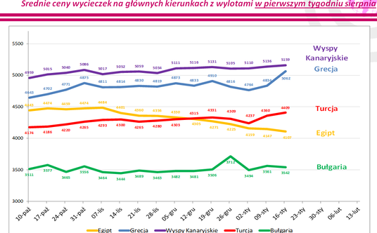 W ostatnim tygodniu średnia cena zagranicznej wycieczki z biurem podróży z wylotem między 31 lipca a 6 sierpnia wzrosła o 71 złotych – wylicza w najnowszym raporcie z badania cen Instytut Badań Rynku Turystycznego Traveldata*. To największy wzrost, jaki miał miejsce od tygodni, a jego zapowiedź przyszła już tydzień temu, kiedy średnia cena podniosła się o 55 złotych. Wcześniejsze notowania pokazywały, że cena spadała dwa razy o 36 złotych, wzrosła o 29 złotych, spadła o 15 złotych, wzrosła o 39 złotych, spadła o 2 złote, spadła o 3 złote, wzrosła o 13, 18 i 32 złote, spadła o 40 złotych i wzrosła o 43 złote.