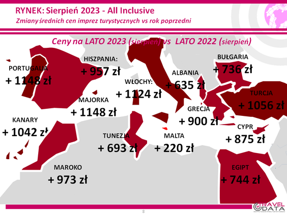 W minionym tygodniu średnia cena wycieczki z biurem podróży z wylotem między 31 lipca a 6 sierpnia 2023 wzrosła o 27 złotych – odnotowuje w najnowszym, sporządzanym co tydzień, raporcie z badania cen Instytut Badań Rynku Turystycznego Traveldata*.