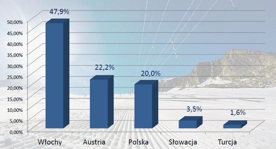 Na pierwszym miejscu w rankingu ulubionych kierunków narciarskich pozostawały Włochy (47,9 procent wszystkich sprzedanych imprez narciarskich), choć w porównaniu z poprzednią zimą ich udział w rynku zmniejszył się 6,5 punktu procentowego. Zyskała natomiast druga pod tym względem Austria – 22,2 procent, wzrost o 8,4 punktu procentowego. Trzecie miejsce w rankingu zajęła Polska z udziałem 20-procentowym. Wyprzedziła czwartą Słowację, którą wybrało na zorganizowany wyjazd 3,5 procent (rok wcześniej 2,5 procent) klientów biur podróży jadących na stoki.