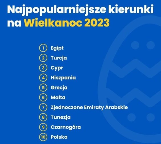 - Egipt to, podobnie jak przed rokiem, wielkanocny bestseller i jeden z dwóch krajów w pierwszej piątce najpopularniejszych kierunków, który utrzymał swoją pozycję w świątecznym rankingu w porównaniu z poprzednim rokiem. Kolejnym jest Cypr zajmujący pozycję trzecią, na pozostałych miejscach widzimy zmiany - komentuje cytowany w komunikacie firmy jej wiceprezes ds. produktu Dominik Miłowski.