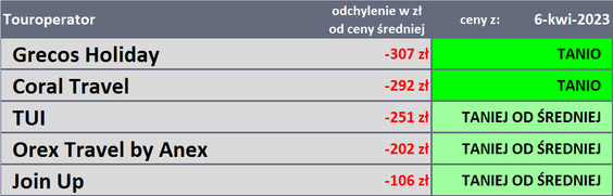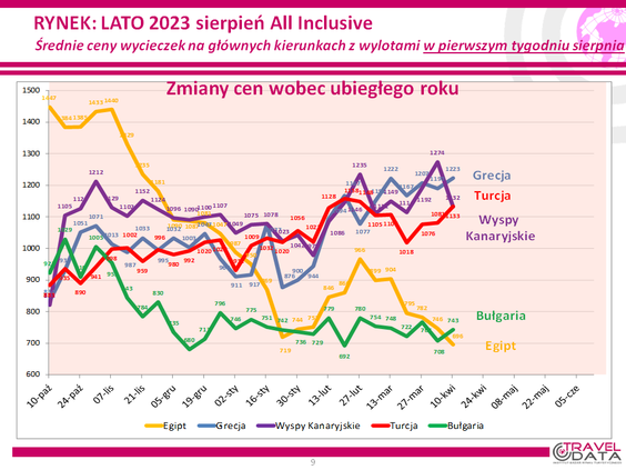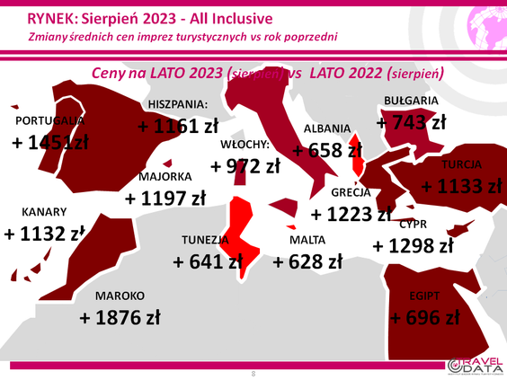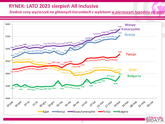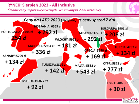 Wszystkie pięć najistotniejszych dla polskich klientów biur podróży kierunków najwięcej podrożała, licząc rok do roku, Grecja, bo o 1223 złote. Pozostałe kraje, jak Turcja, Wyspy Kanaryjskie, Bułgaria i Egipt – zdrożały odpowiednio o 1133, 1132, 743 i 696 złotych.