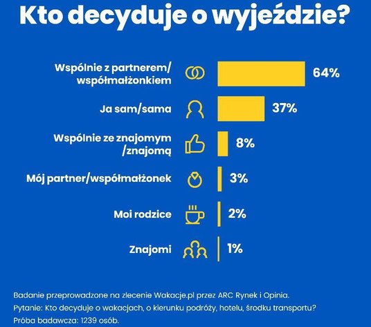 Z badań zleconych przez Wakacje.pl jeszcze w zeszłym roku wynika, że 64 procent respondentów decyzję o celu podróży i sposobie jej organizacji podejmuje wspólnie z partnerem/współmałżonkiem. Najczęściej są to osoby w wieku 30-45 lat (67 procent), 46-65 lat (62 procent) i 20-29 lat podróżujący z dziećmi (61 procent), nieco rzadziej turyści z tej ostatniej grupy wiekowej podróżujący bez dzieci (56 procent).