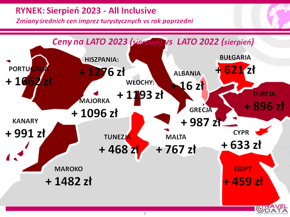Porównując średnie ceny wycieczek na lato w ofertach dużych i średnich organizatorów u żadnego z nich Traveldata nie zanotowała niższych stawek. Najmniej podrożały wyjazdy z Prima Holiday, ETI i Itaką - o 210, 220 i 570 złotych. Średnie ceny w pozostałych biurach podróży były wyższe niż przed rokiem od około 580 złotych (Sun & Fun) do prawie 1300 złotych – odnotowują autorzy raportu.