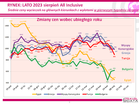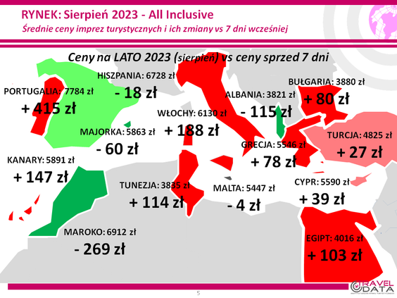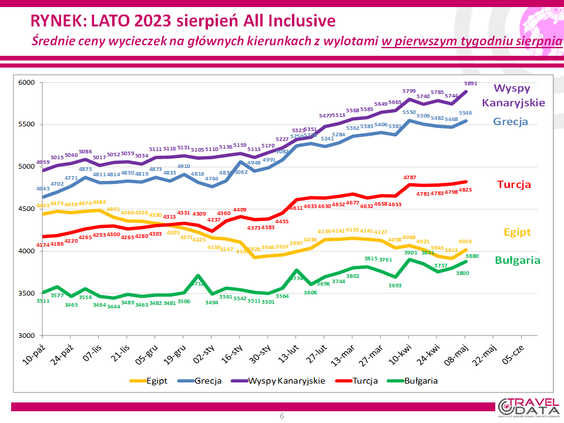 Monitoring ujawnił, że najwięcej najtańszych ofert wyjazdów wakacyjnych do Egiptu proponowały w zeszłym tygodniu Anex Travel (6), Join UP (5) i Coral Travel (4), do Grecji Itaka (10), Grecos, TUI Poland (po 6) i Rainbow (5), na Wyspy Kanaryjskie TUI Poland (12), Itaka (7) i Rainbow (4 ), do Turcji Coral Travel (7), Itaka (5) i TUI Poland (3), do Tunezji Coral Travel (5) i TUI Poland (3), a do Bułgarii TUI Poland (3) i Anex Travel (2 oferty).