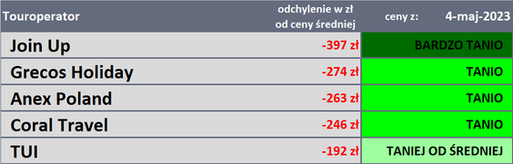 W ostatniej części materiału autorzy zamieszczają tabelę z biurami podróży, które oferowały w ostatnim tygodniu wyjazdy po przekrojowo najniższych cenach. W trzydziestym zestawieniu dla sezonu lato 2023 skład biur podróży w tabeli pozostał taki sam, ale zmianom uległy ich pozycje. Z miejsca czwartego na drugie awansował Grecos, a o jedną pozycję w dół spadły Anex Travel (z drugiej na trzecią) i Coral Travel (z trzeciej na czwartą). Na miejscu lidera pozostało biuro Join UP.