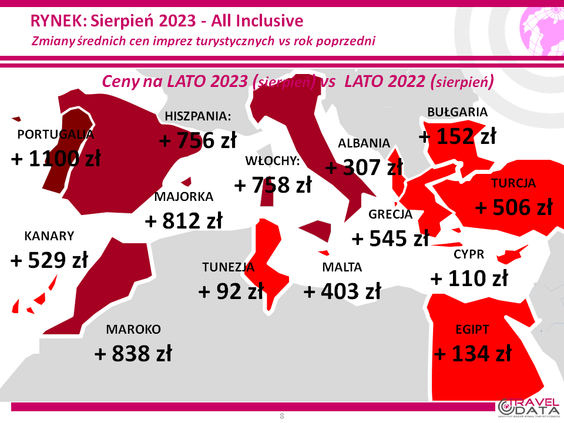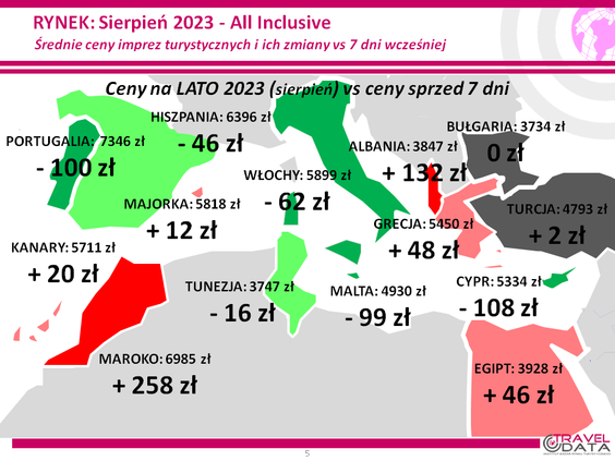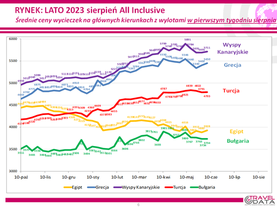 W ostatnim tygodniu średnia cena wycieczki z wylotem między 31 lipca a 6 sierpnia 2023 wzrosła o 20 złotych – wskazuje Instytut Badań Rynku Turystycznego Traveldata w tygodniowym omówieniu wyników monitorowania cen ofert biur podróży*.