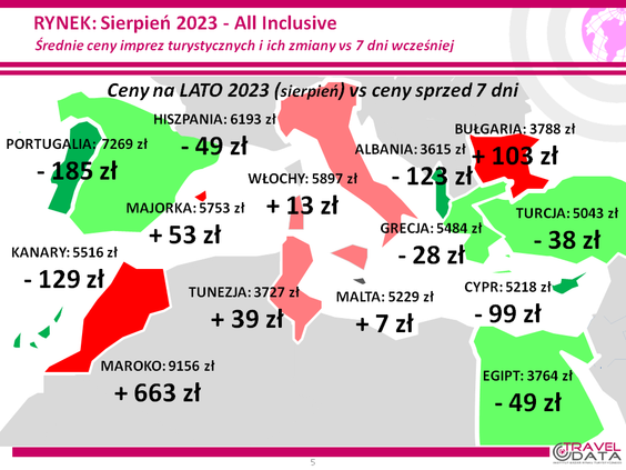 Największe zwyżki średnich cen w ostatnim tygodniu można było z kolei zauważyć w wypadku Maroka, o 663 złote, Kalabrii, o 132 złote, i Korfu (poprzednio ceny tam znacznie spadły) – o 120 złotych.