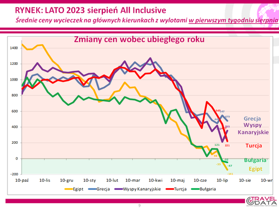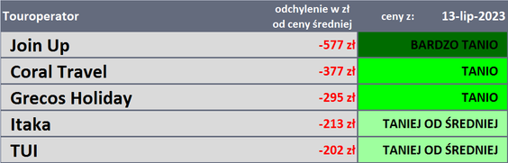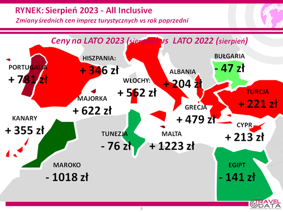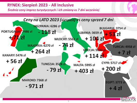 Jak wyjaśniają autorzy analizy, największe zwyżki średnich cen w ostatnim tygodniu zanotowano w wypadku wyjazdów na Teneryfę, o 740 złotych, na Maltę (ponownie), o 403 złote, i na Kretę – o 272 złote. Największe zniżki cen wystąpiły zaś w wypadku Maroka, średnio o 971 złotych, półwyspu Chalcydyckiego, o 417 złotych, i Gran Canarii - o 376 złotych.