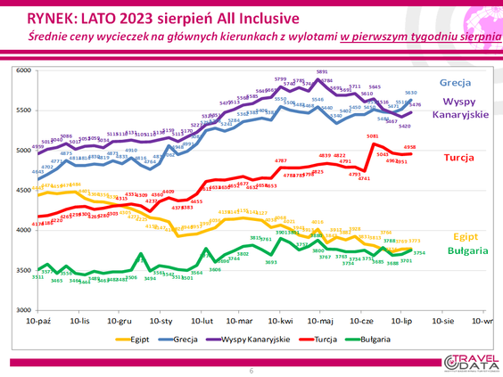 Średnia cena wycieczki z wylotem między 31 lipca a 6 sierpnia 2023 wzrosła w zeszłym tygodniu o 20 złotych – informuje w najnowszym, podawanym co tydzień, raporcie z monitorowania cen w biurach podróży Instytut Badań Rynku Turystycznego Traveldata*.