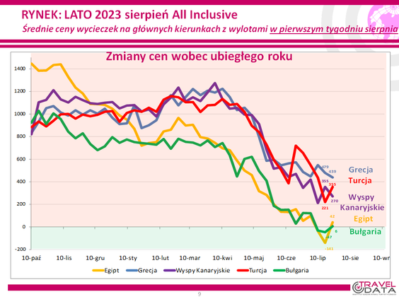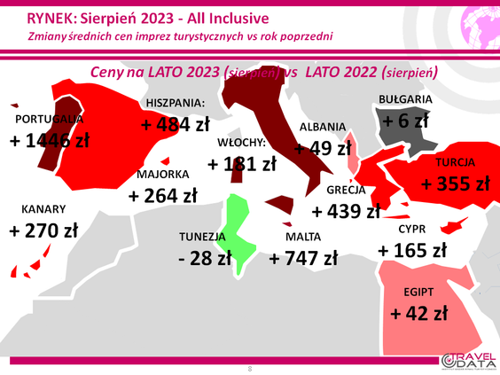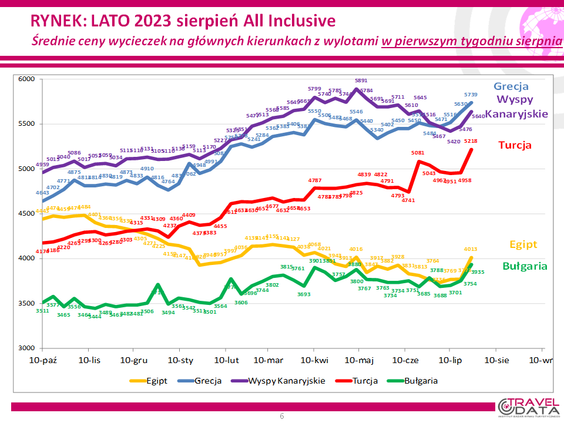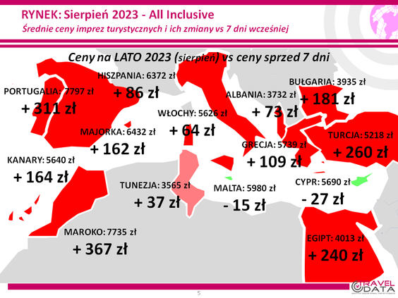 Średnia cena wycieczki z wylotem między 31 lipca a 6 sierpnia 2023 roku, wzrosła w zeszłym tygodniu o 156 złotych – informuje w najnowszym badaniu cen w największych biurach podróży Instytut Badań Rynku Turystycznego Traveldata*.