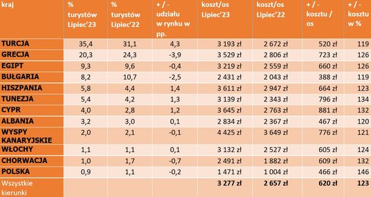 W lipcu najpopularniejszym zagranicznym kierunkiem była Turcja, co nie jest zaskoczeniem, bo tak jest od kilku sezonów. Dodatkowo w tym sezonie na polski rynek weszli nowi touroperatorzy, mający w swojej ofercie przede wszystkim Turcję w cenach, które niektórzy dotychczasowi gracze określali jako dumpingowe.