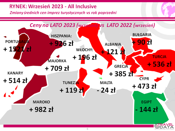 Z kolei największy spadek cen dotyczył Szarm el-Szejk, o 282 złote, a wyraźnie mniejszy Marsa Alam i Hurghady - o 101 i 49 złotych – informuje Traveldata.